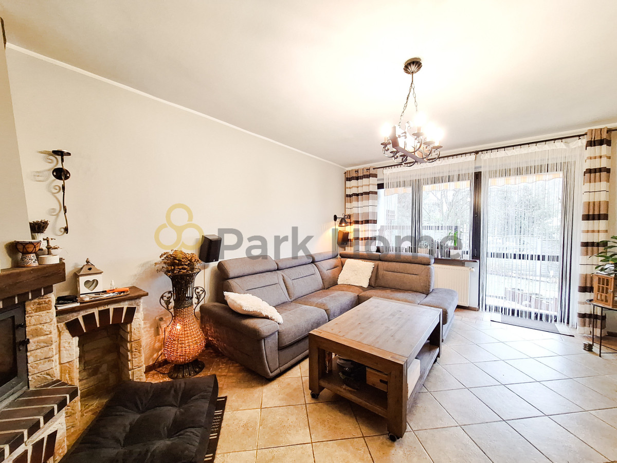 Dodatkowo, w salonie znajduje się elegancki kominek z instalacją nadmuchu ciepłego powietrza, tworzący przytulny klimat i umożliwiający efektywne ogrzewanie przestrzeni.