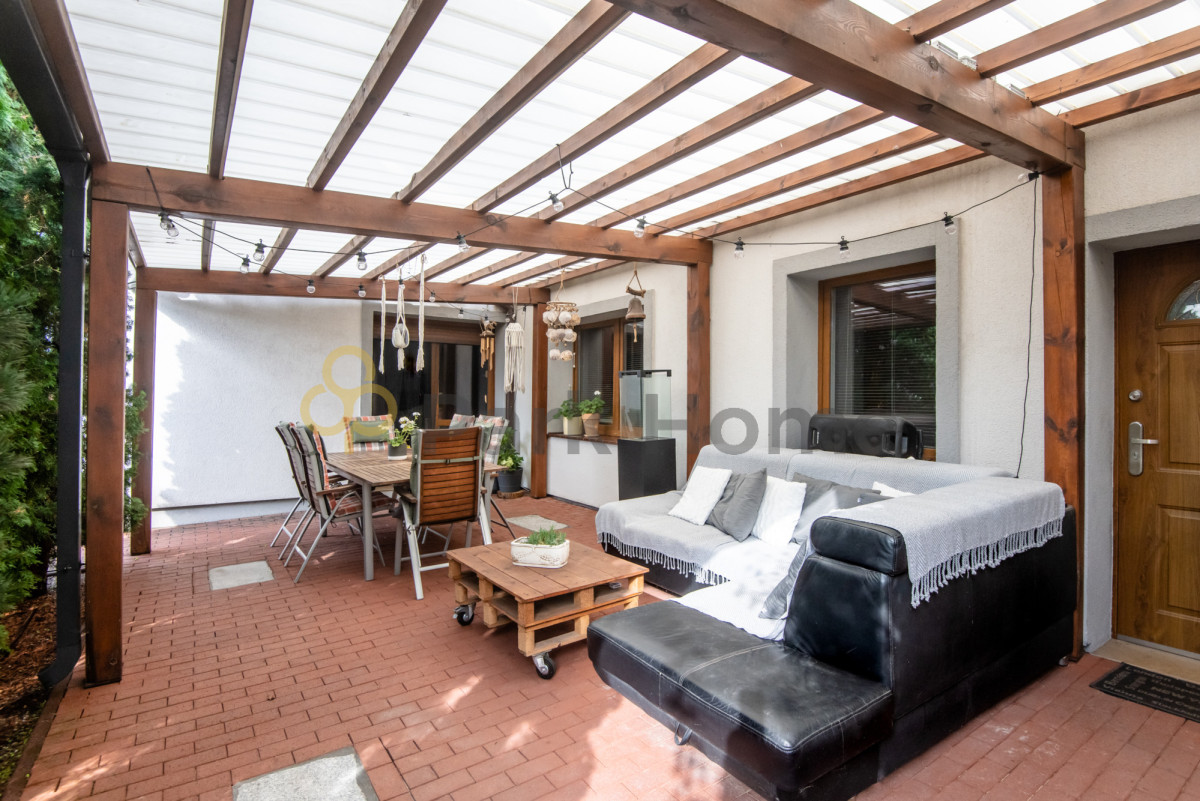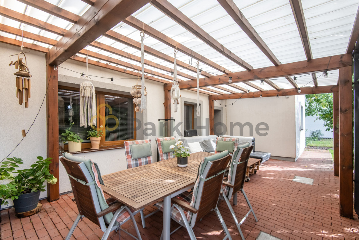 Nie sposób też nie wspomnieć o pięknym, zadaszonym tarasie - to prawdziwe serce domu. Otoczony zadbaną zielenią, daje poczucie prywatności i pozwala cieszyć się relaksem na świeżym powietrzu niezależnie od pogody.