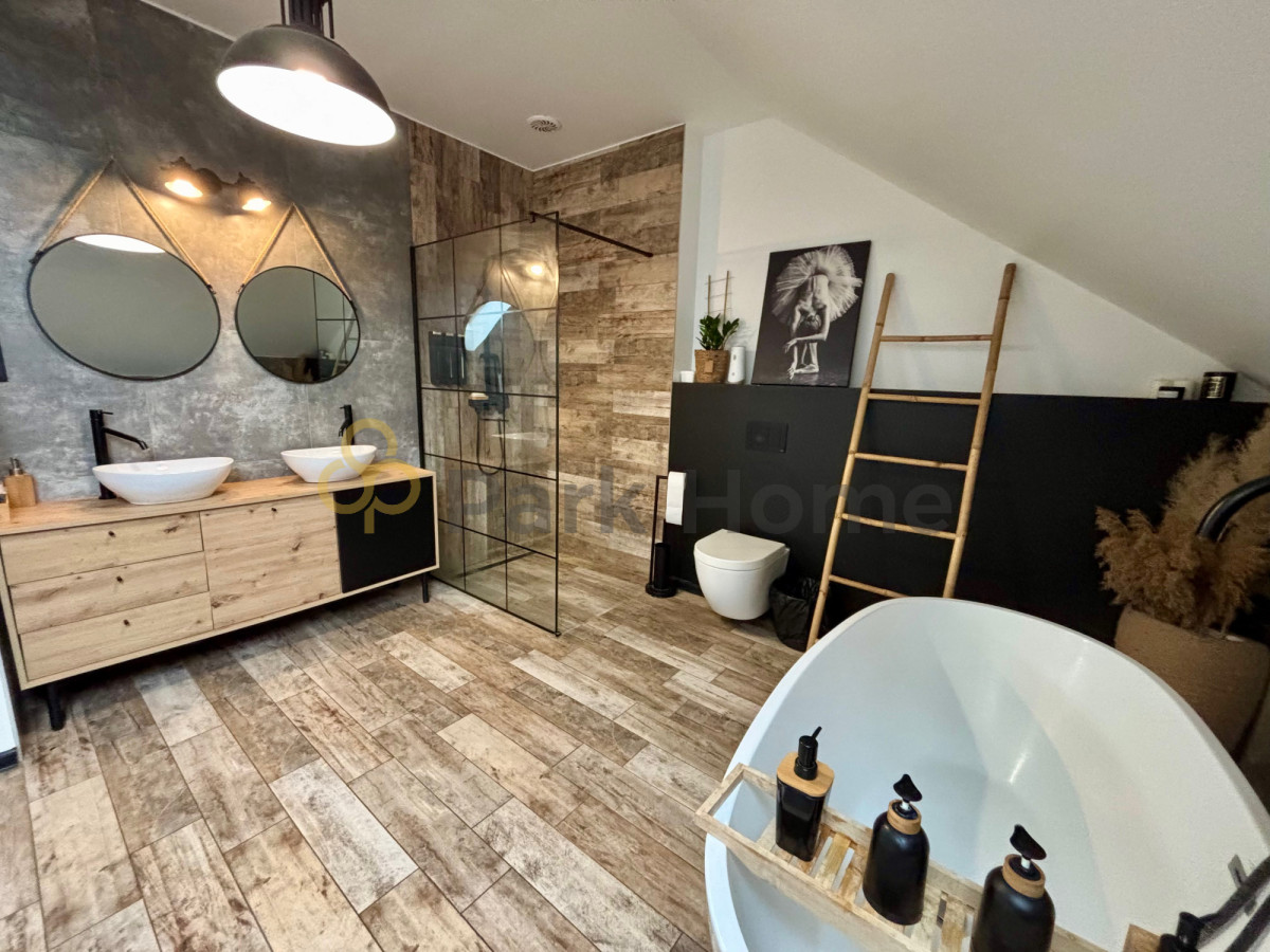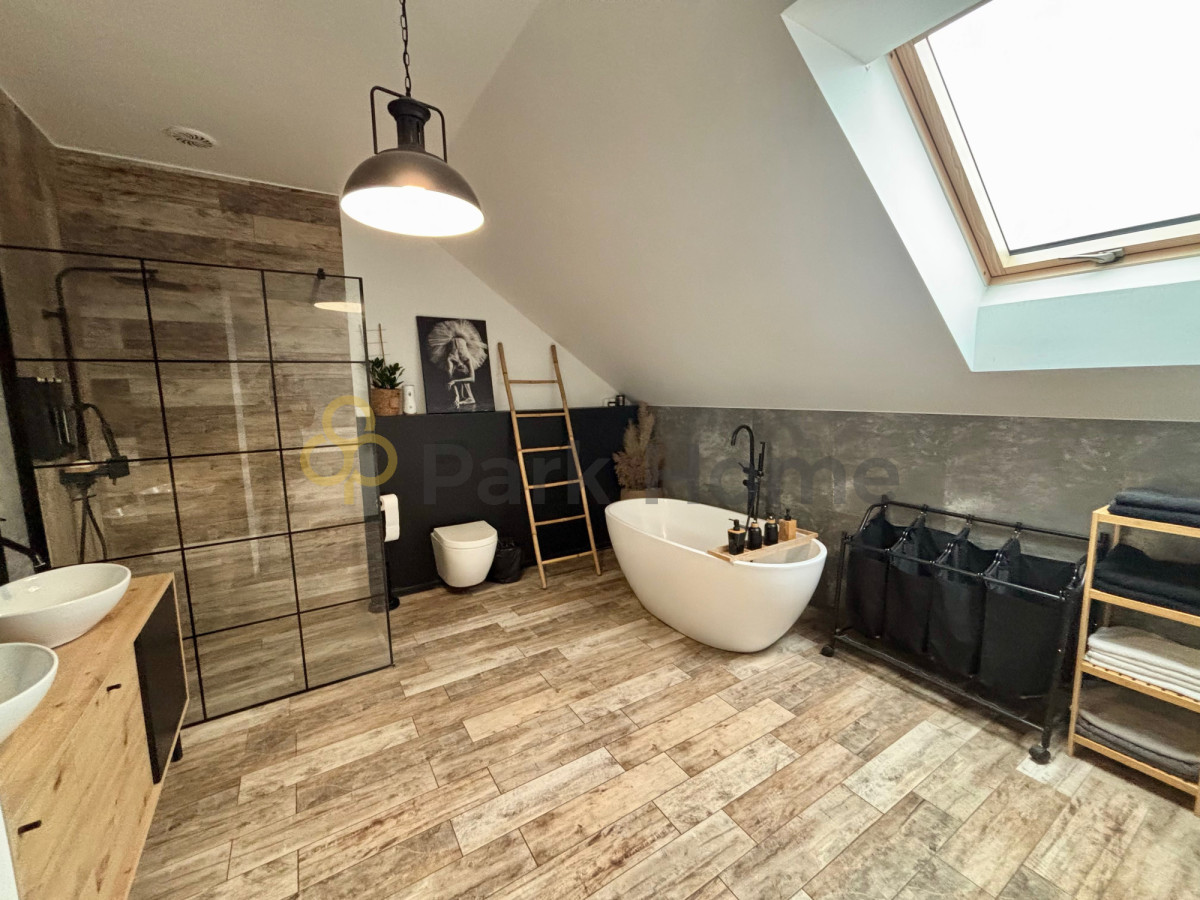 • Duża łazienka z oknem - prysznic typu walk‑in + wolnostojąca wanna