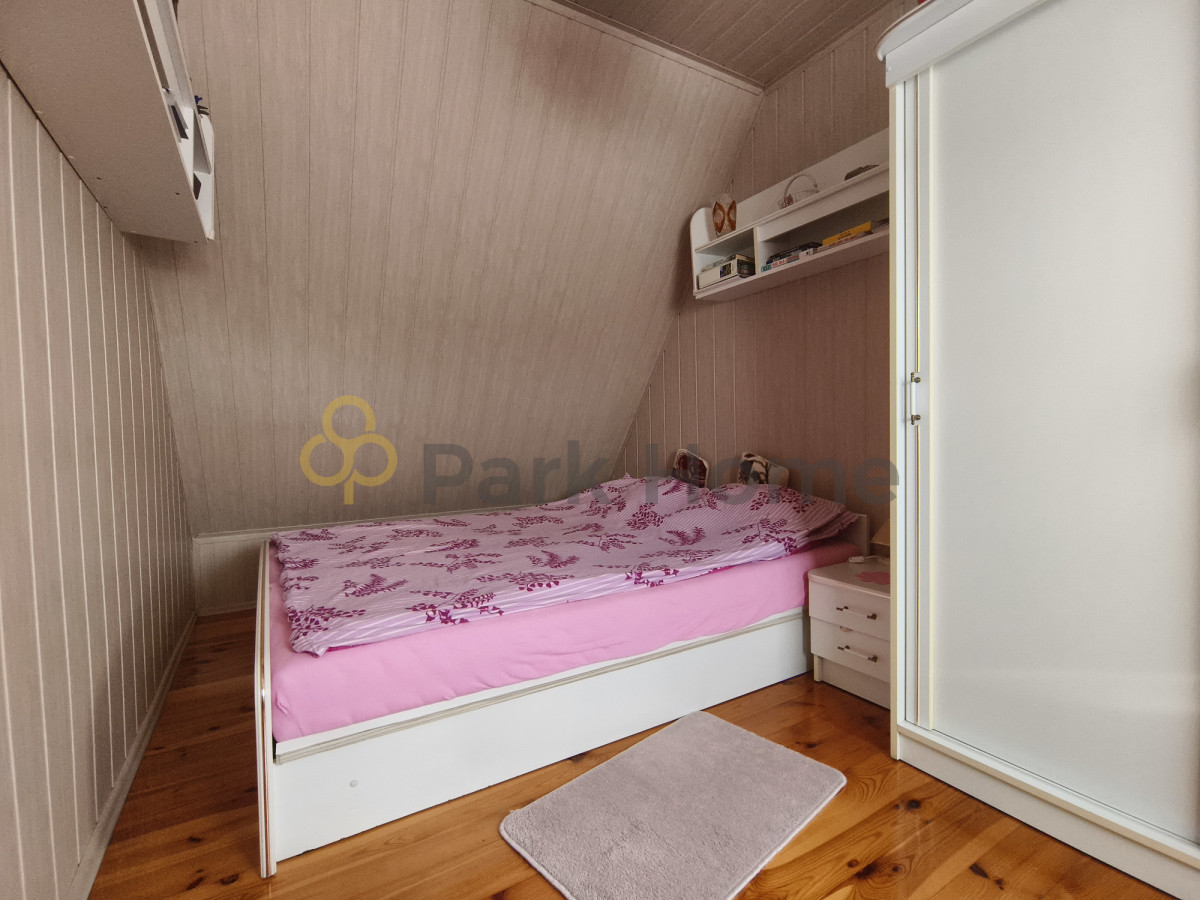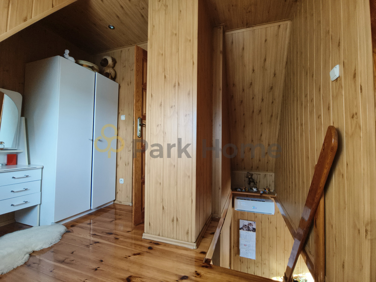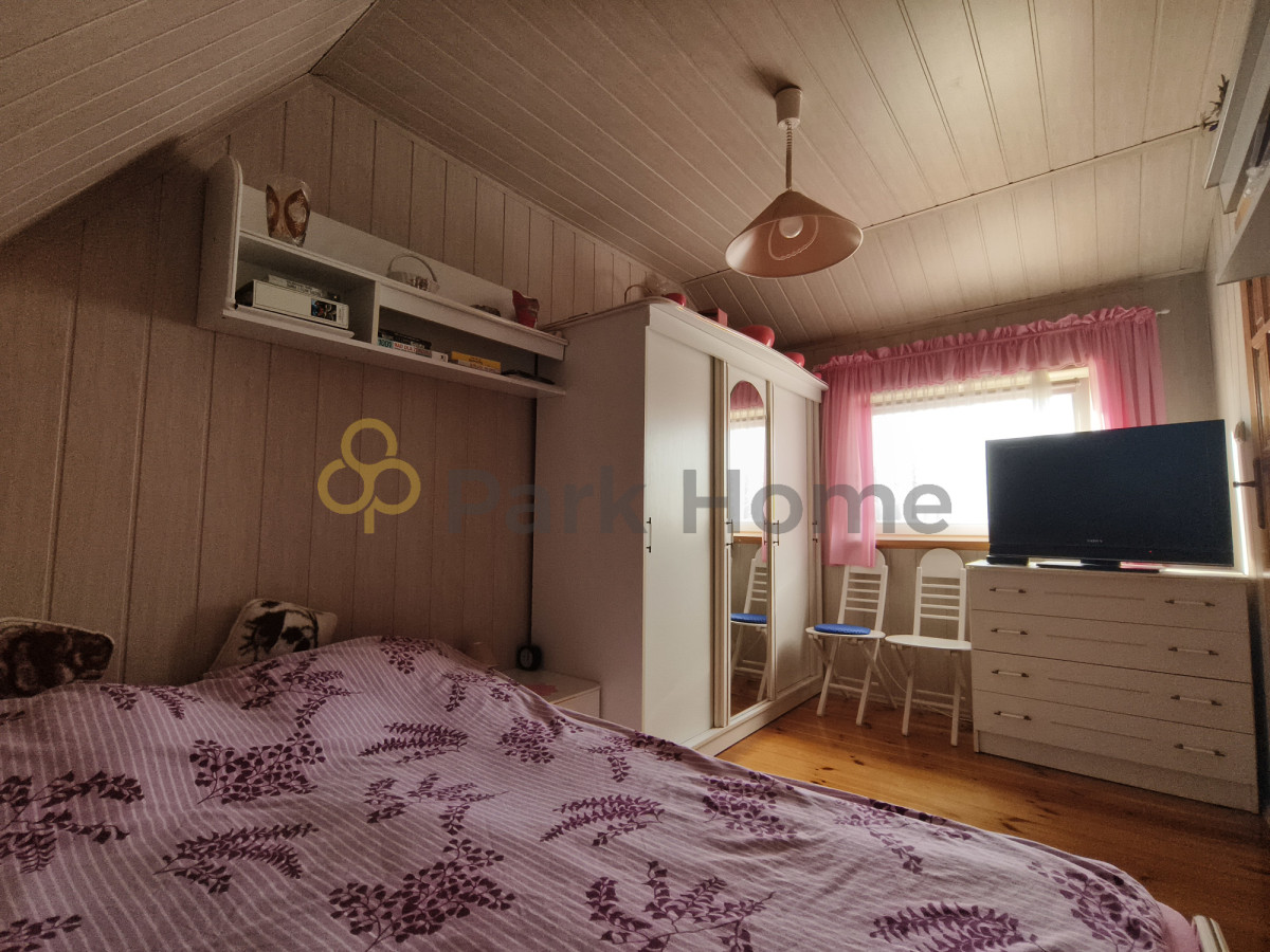 Na poddaszu znajdują się pokój, sypialnia i łazienka. Podłoga wykonana z desek drewnianych. Cały wystrój zachowuje spójny, klimatyczny charakter.