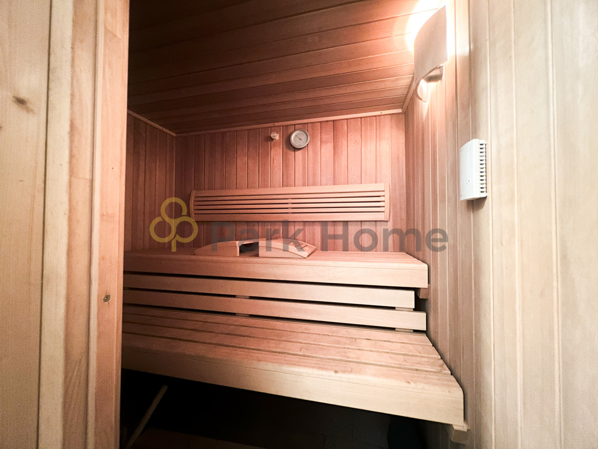 W piwnicy znajduje się garaż, pomieszczenie gospodarcze oraz - sauna i prysznic.