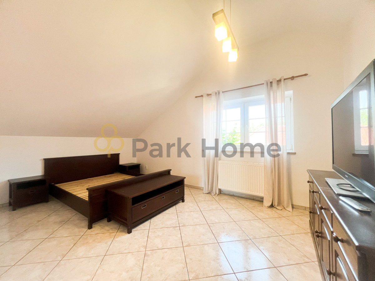 Na parterze znajduje się otwarta kuchnia połączona z jadalnią oraz przestronnym salonem, co tworzy przytulną i jasną strefę dzienną. Dodatkowo na tym poziomie znajduje się sypialnia oraz salonu z którego można wyjść na taras i ogród, co zapewnia doskonałe warunki do odpoczynku.