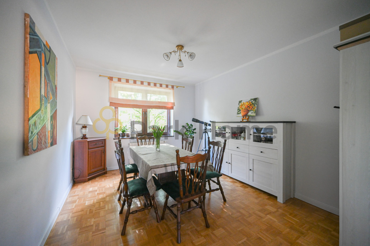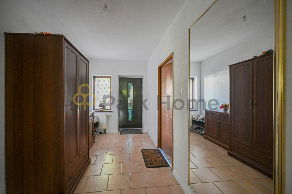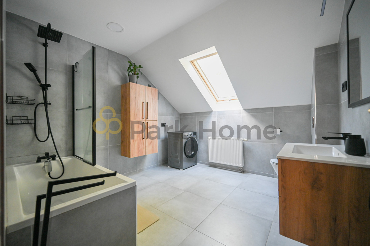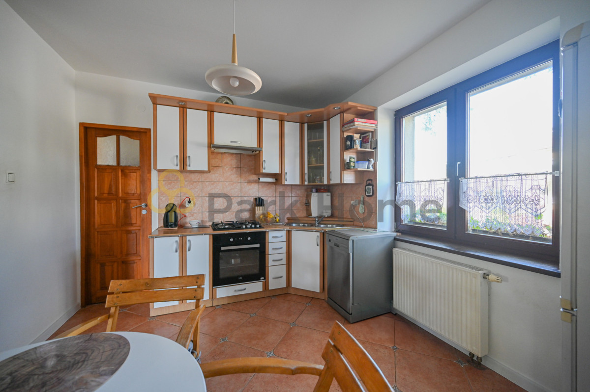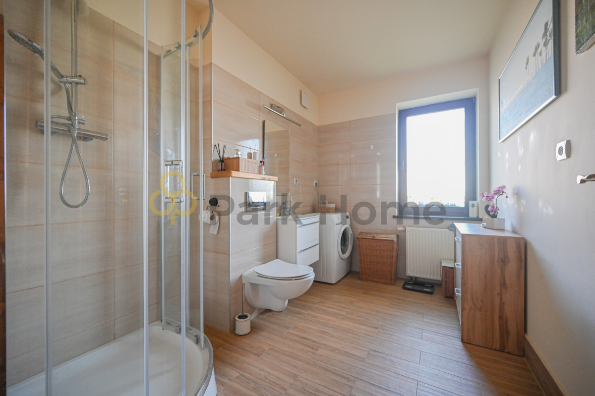 Przedstawiam Państwu trzykondygnacyjny dom wolnostojący wybudowany w 2000 roku. Powierzchnia użytkowa części mieszkalnej wynosi 220,2 mkw. (po podłodze 245 mkw.) Powierzchnia całkowita wraz z piwnicą (155,9 mkw.) wynosi łącznie 409,90 mkw. W środku obecnie funkcjonują dwa niezależne od siebie mieszkania, dla których zostały wydane zaświadczenia o samodzielności lokali. Część wspólną stanowią wejście i klatka schodowa. Bardzo łatwo wykorzystać dom dla potrzeb jednej, dużej rodziny. Pokoje na piętrze zostały wyremontowane około 3 lata temu, gdzie została wykonana m.in. nowa kuchnia na wymiar, łazienka, wycyklinowano wszystkie parkiety oraz wymieniono okna i zamontowano klimatyzacje. Na parterze 3 lata temu wycyklinowano wszystkie parkiety, odmalowano ściany oraz wyremontowano łazienkę. Do nieruchomości przynależy w pełni ogrodzona, zielona, częściowo zadrzewiona działka o powierzchni 703 mkw. Znajduje się na niej zadaszona wiata, oczko wodne, nasadzenia oraz trawnik. Dojście do ogrodu prowadzi od głównej drogi lub z tarasu. Każdy z dwóch garaży posiada oddzielną automatyczną bramę i utwardzony podjazd, na którym mogą zaparkować kolejne samochody. Dojazd do posesji stanowią tylko drogi asfaltowe. Z mieszkania na piętrze jest wejście na strych przeznaczony do zaadaptowania pod przestrzeń magazynową.