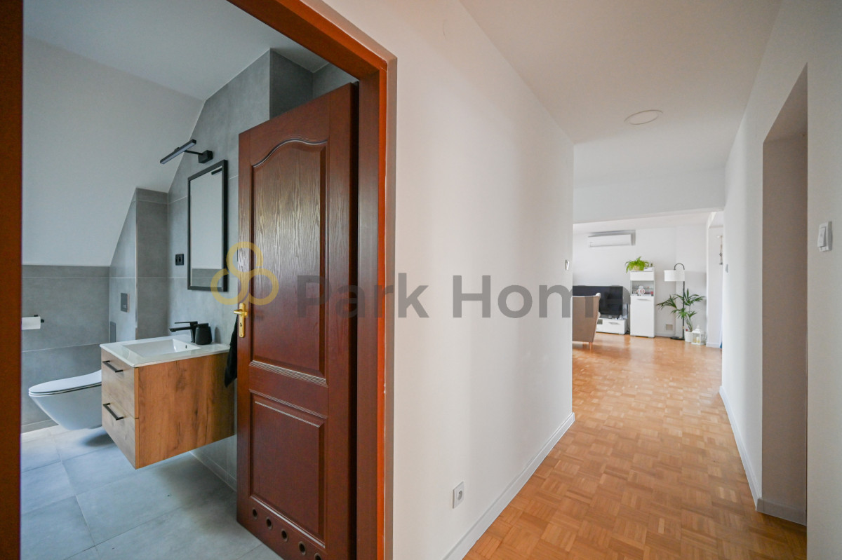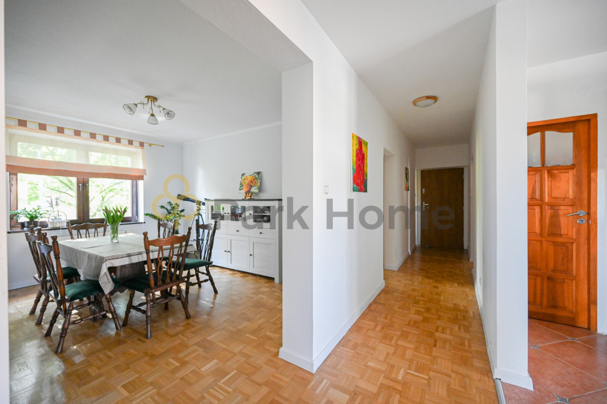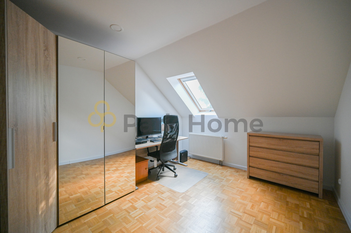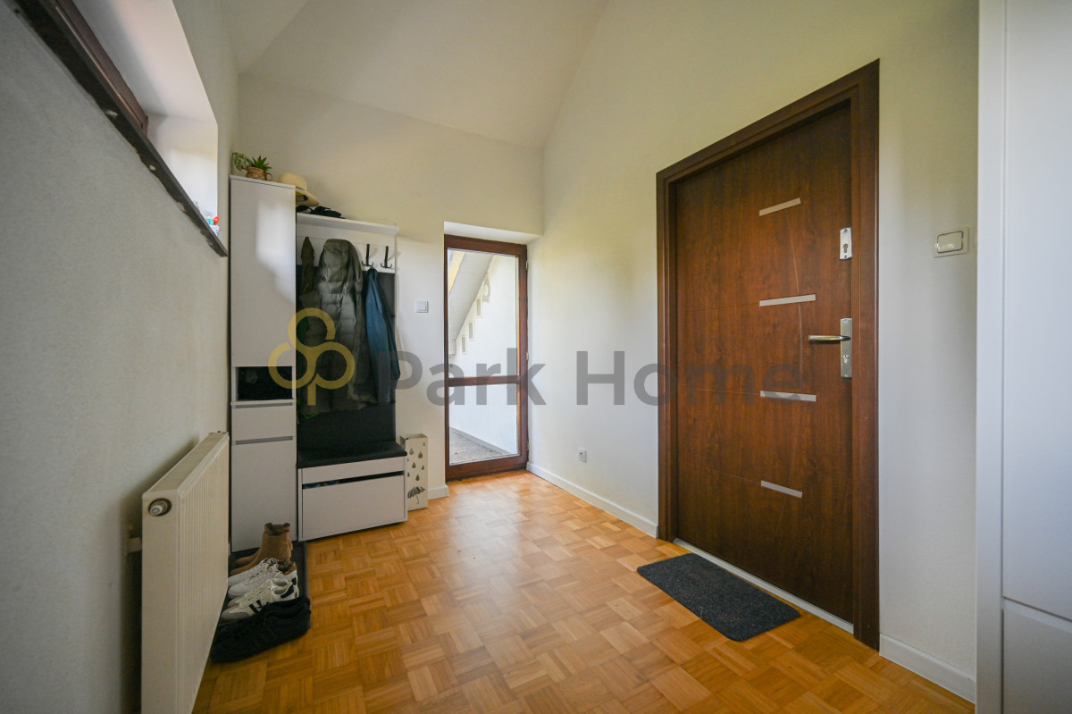Przedstawiam Państwu trzykondygnacyjny dom wolnostojący wybudowany w 2000 roku. Powierzchnia użytkowa części mieszkalnej wynosi 220,2 mkw. (po podłodze 245 mkw.) Powierzchnia całkowita wraz z piwnicą (155,9 mkw.) wynosi łącznie 409,90 mkw. W środku obecnie funkcjonują dwa niezależne od siebie mieszkania, dla których zostały wydane zaświadczenia o samodzielności lokali. Część wspólną stanowią wejście i klatka schodowa. Bardzo łatwo wykorzystać dom dla potrzeb jednej, dużej rodziny. Pokoje na piętrze zostały wyremontowane około 3 lata temu, gdzie została wykonana m.in. nowa kuchnia na wymiar, łazienka, wycyklinowano wszystkie parkiety oraz wymieniono okna i zamontowano klimatyzacje. Na parterze 3 lata temu wycyklinowano wszystkie parkiety, odmalowano ściany oraz wyremontowano łazienkę. Do nieruchomości przynależy w pełni ogrodzona, zielona, częściowo zadrzewiona działka o powierzchni 703 mkw. Znajduje się na niej zadaszona wiata, oczko wodne, nasadzenia oraz trawnik. Dojście do ogrodu prowadzi od głównej drogi lub z tarasu. Każdy z dwóch garaży posiada oddzielną automatyczną bramę i utwardzony podjazd, na którym mogą zaparkować kolejne samochody. Dojazd do posesji stanowią tylko drogi asfaltowe. Z mieszkania na piętrze jest wejście na strych przeznaczony do zaadaptowania pod przestrzeń magazynową.