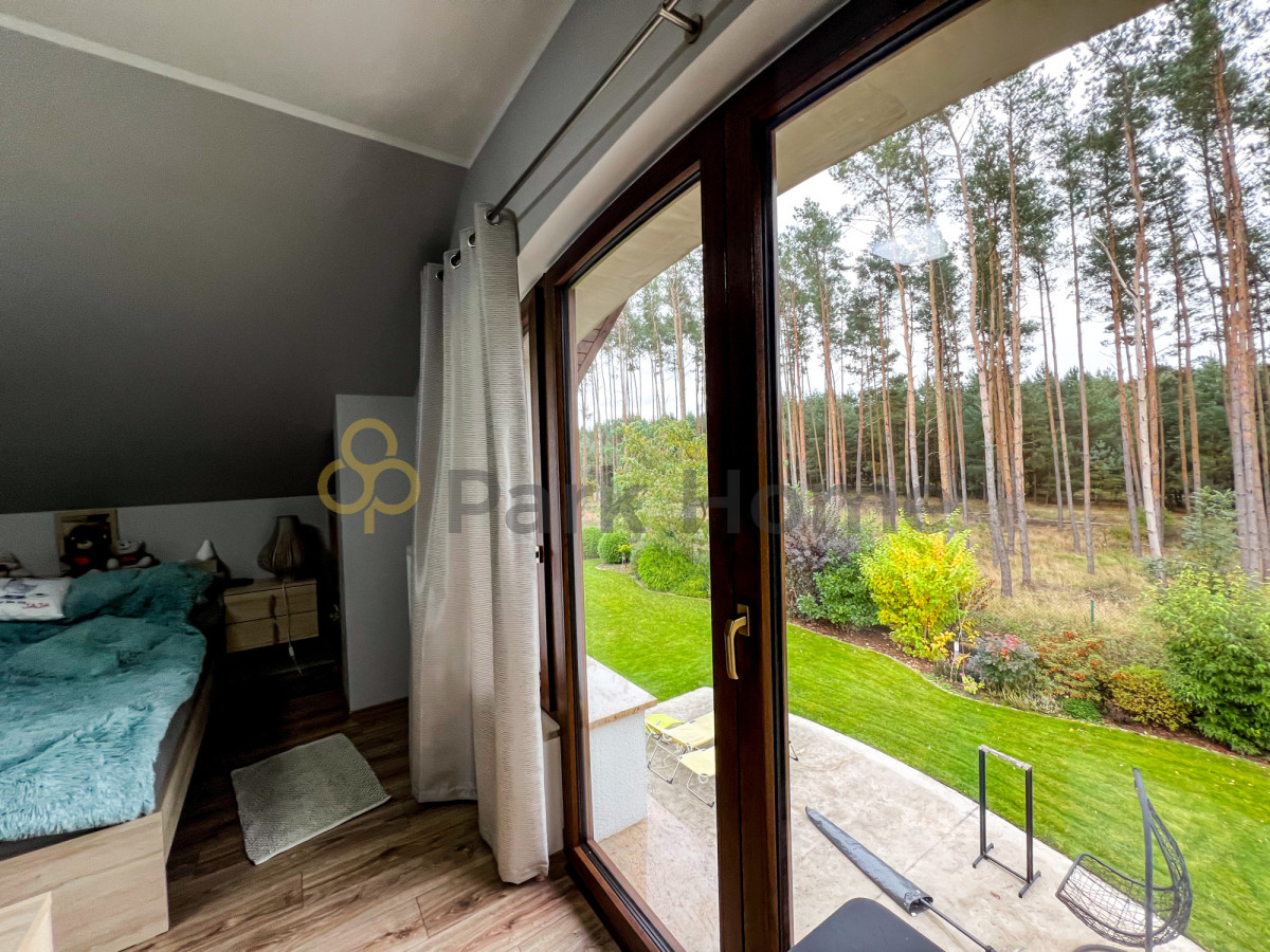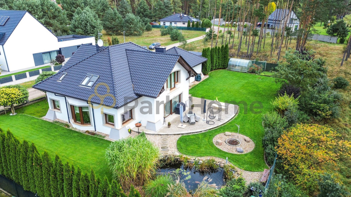 Otoczony zielonym lasem i ogrodem dom, stwarza unikalne miejsce, gdzie codzienne życie splata się z naturą. Ogród bogaty w nasadzenia krzewów ,drzew ozdobnych, nienaganny trawnik oraz część gospodarcza ze szklarnią z poliwęglanu i domkiem drewnianym na narzędzia. Ogród rozprowadzone ma nawodnienie sterowane ze sterownika. Dom posiada też własną studnię.