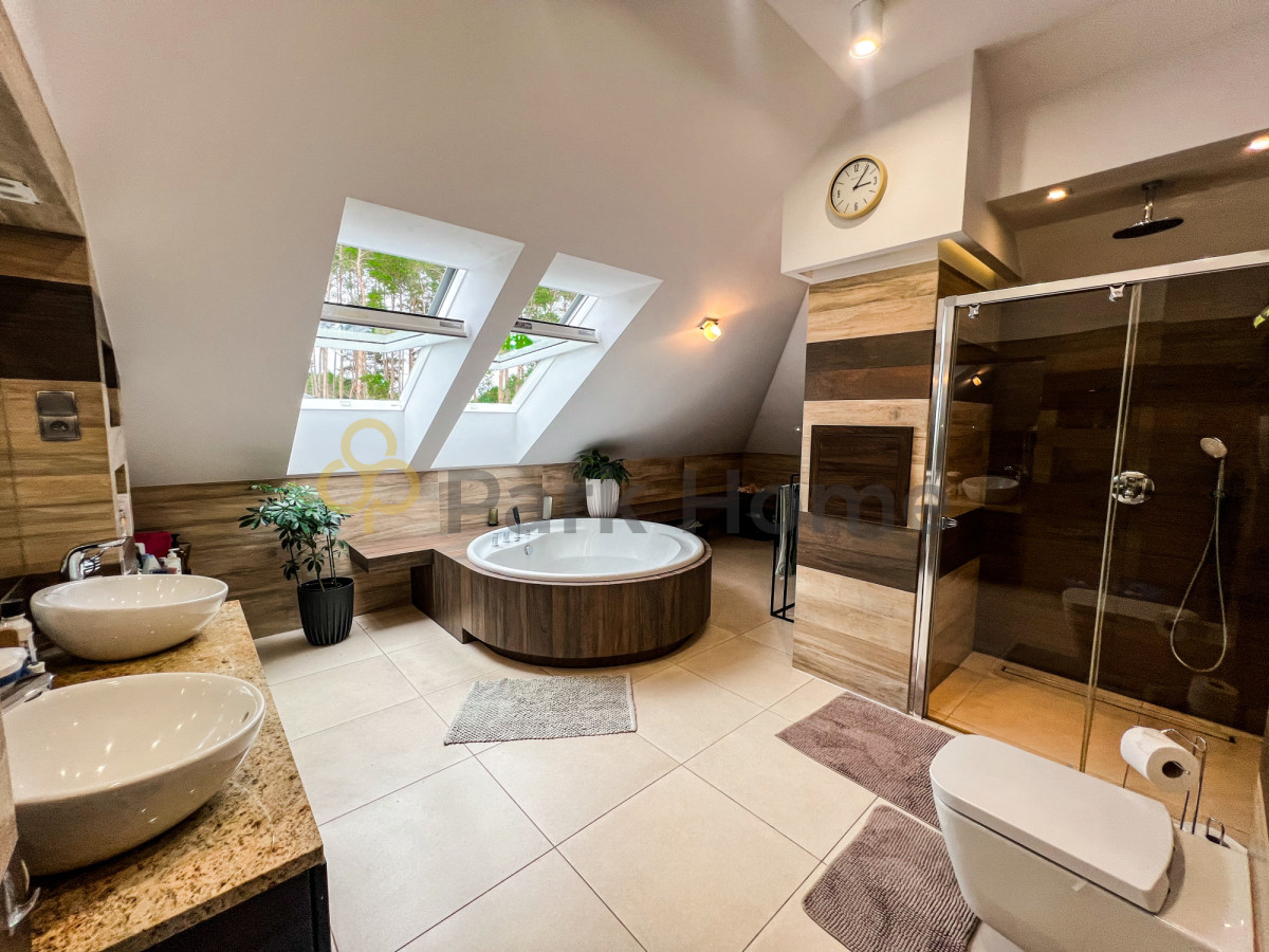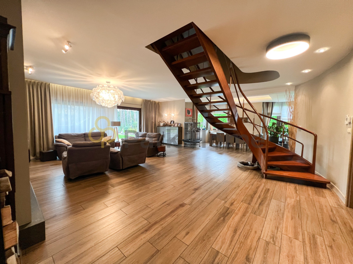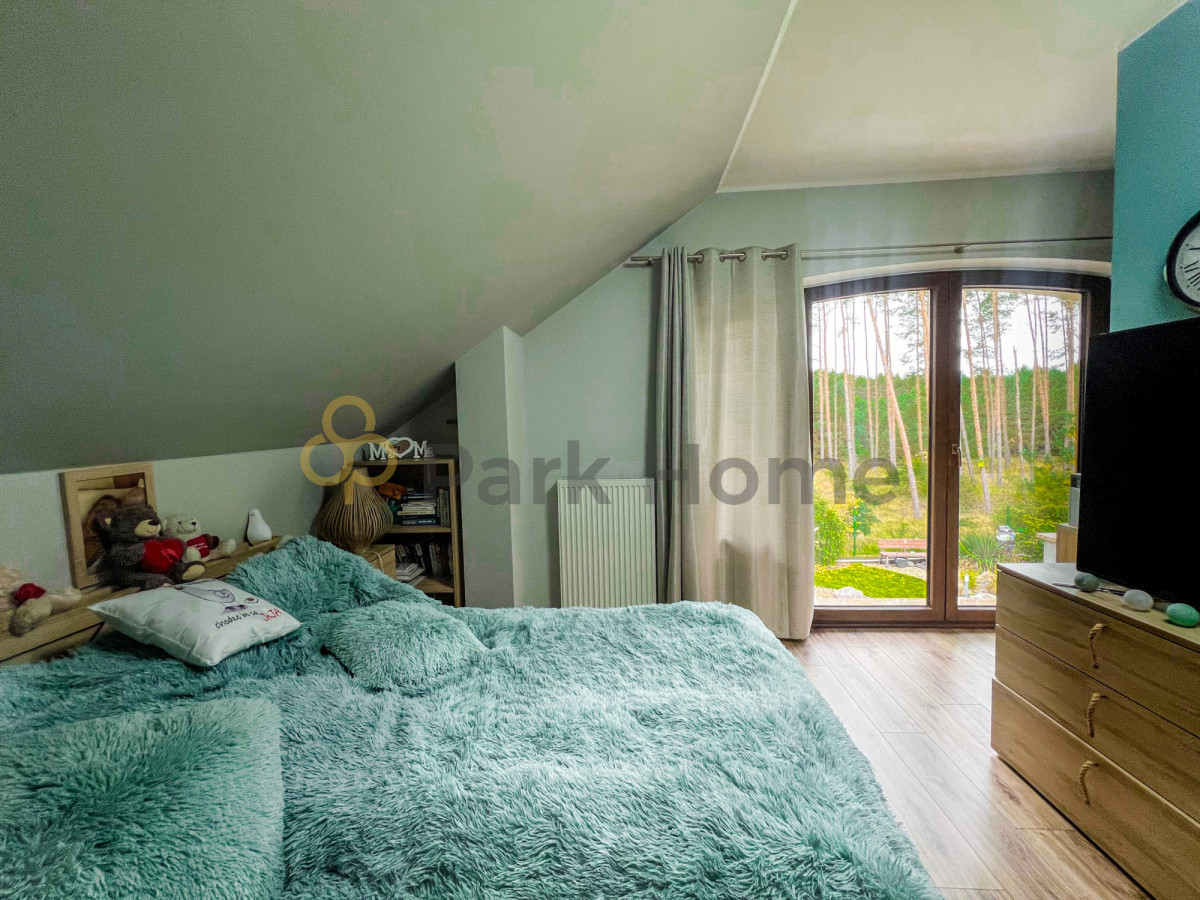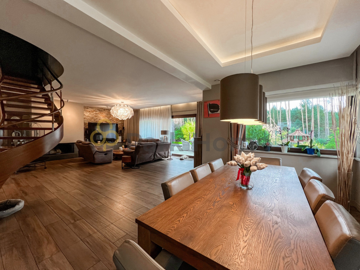 Wnętrze domu to przestronny salon z wyjściem na 80 metrowy taras, jasna kuchnia , jadalnia oraz 5 sypialni z garderobami. Pokoje niezwykle przestronne, dające wiele możliwości aranżacji. Bogato wyposażona kuchnia, z nowoczesnymi urządzeniami AGD. Dodatkowym atutem jest połączenie kuchni z jadalnią, do której przez liczne okna wpada wiele światła, a widok lasu zza okien cieszy zmysły podczas celebracji posiłków.
