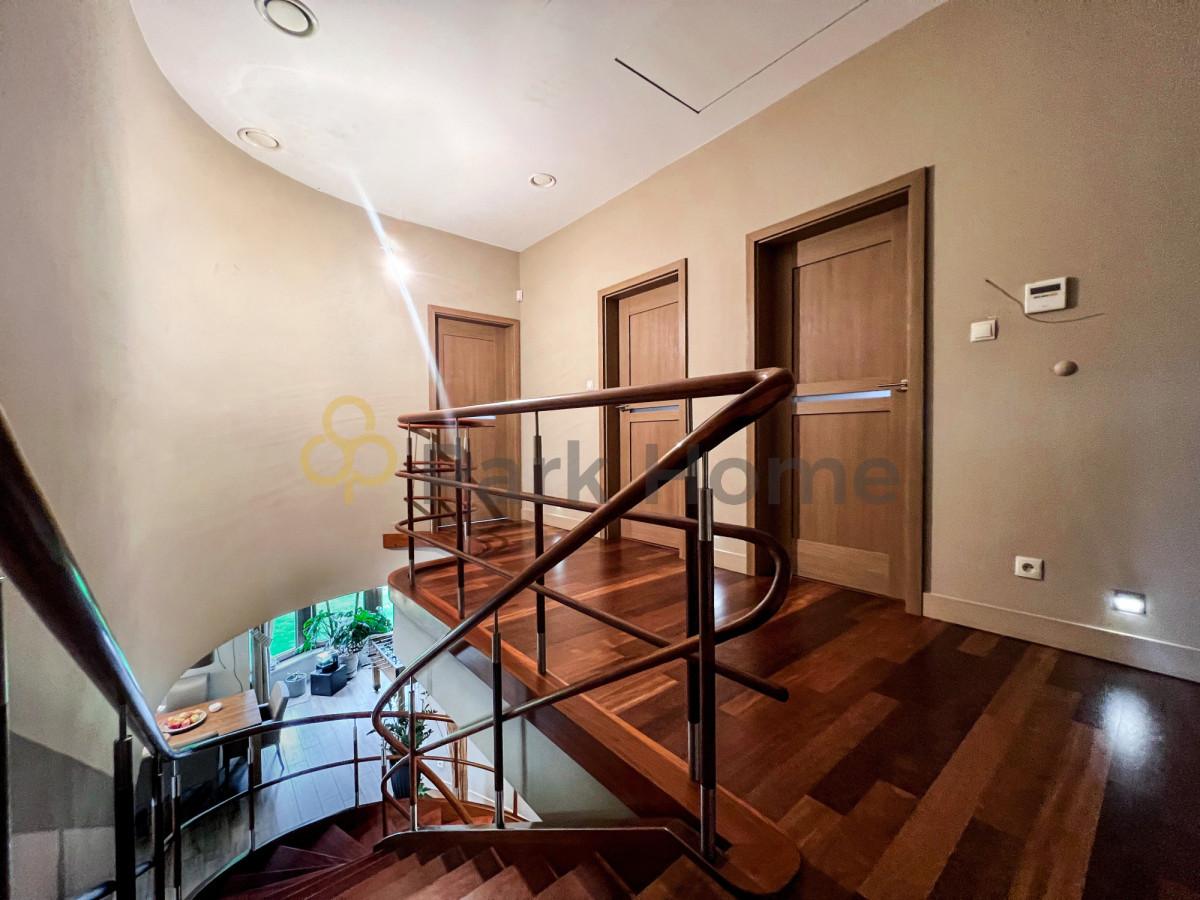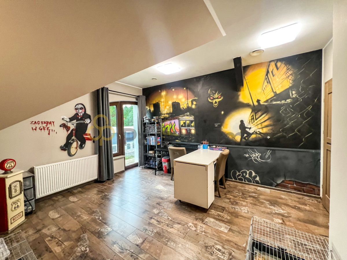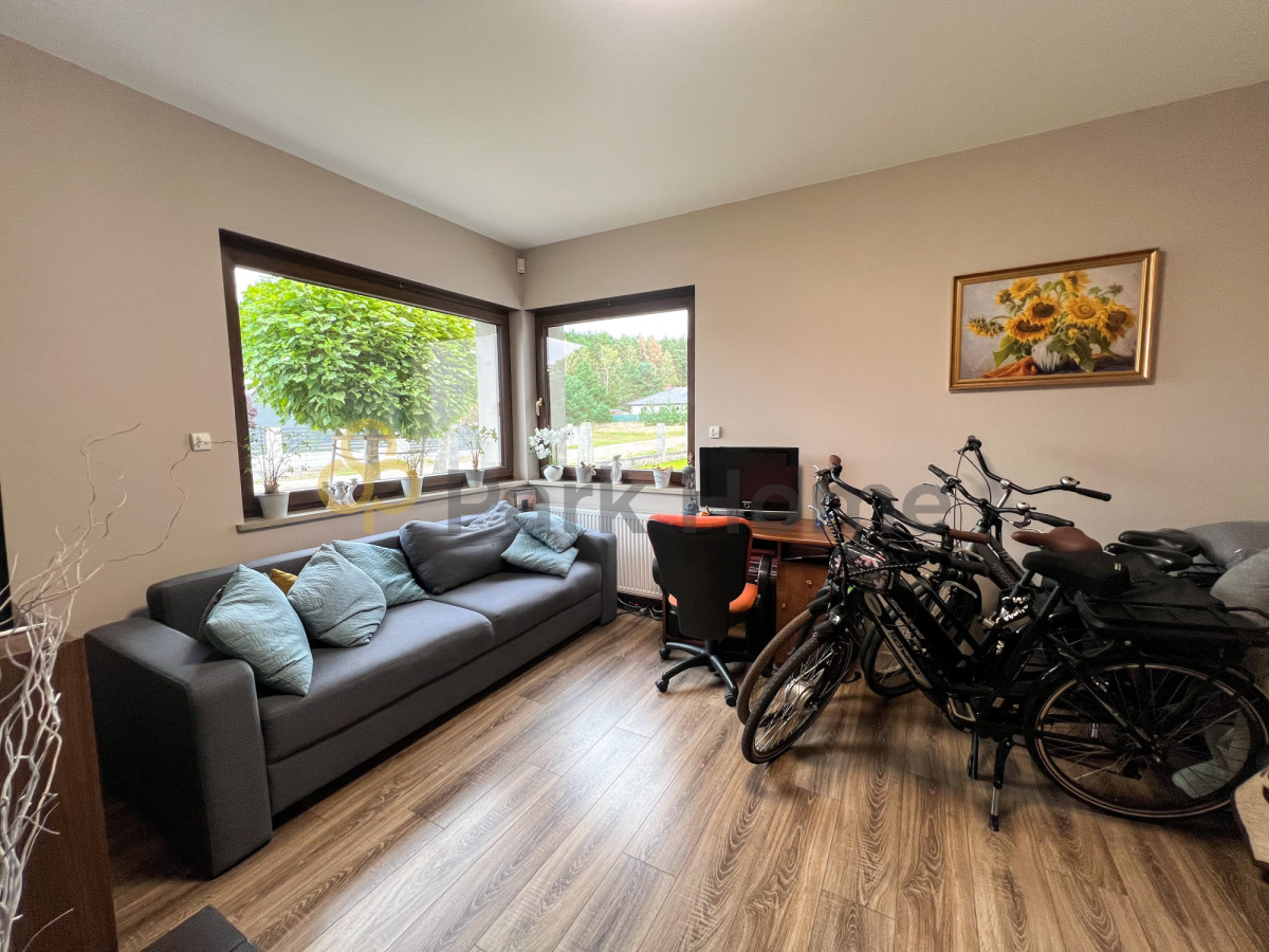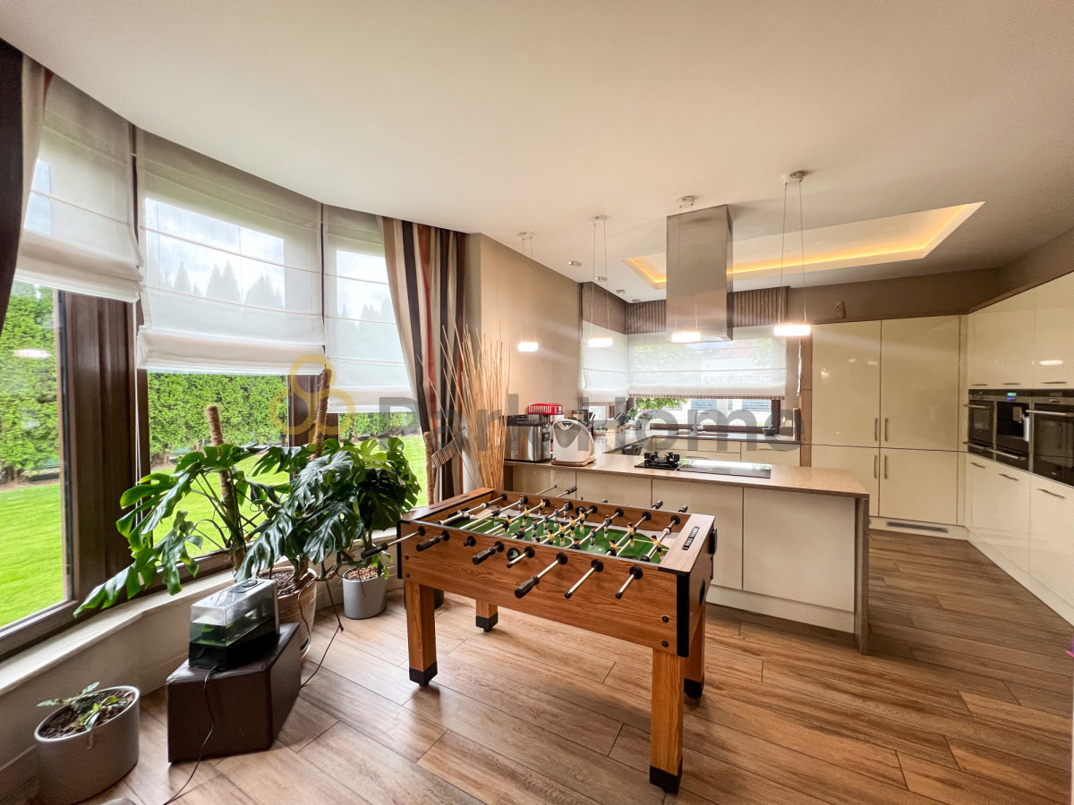 Wnętrze domu to przestronny salon z wyjściem na 80 metrowy taras, jasna kuchnia , jadalnia oraz 5 sypialni z garderobami. Pokoje niezwykle przestronne, dające wiele możliwości aranżacji. Bogato wyposażona kuchnia, z nowoczesnymi urządzeniami AGD. Dodatkowym atutem jest połączenie kuchni z jadalnią, do której przez liczne okna wpada wiele światła, a widok lasu zza okien cieszy zmysły podczas celebracji posiłków.