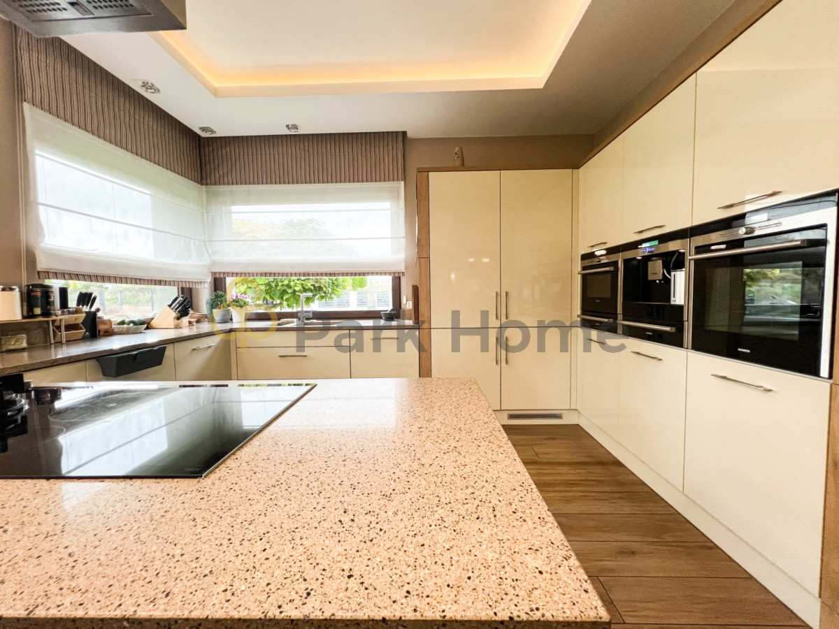 W kuchni znajdziemy filtr wody pitnej, blaty kamienne KEMIZO i wysokiej klasy sprzęty SIEMENS.
