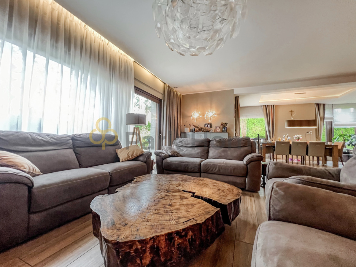 Salon ociepla kominek SZPARCHEN, a uroku dodaje ława ze 100 letniego drzewa, żyrandol firmy MILANO, a także długie zasłony. Stół jadalniany wykonany z litego drewna, krzesła ze skóry. Wszędzie podwieszany sufit.