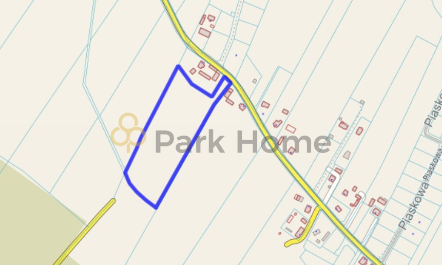 Działka w kształcie zbliżonym do prostokąta z wytyczoną drogą dojazdową.