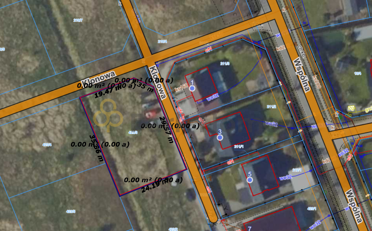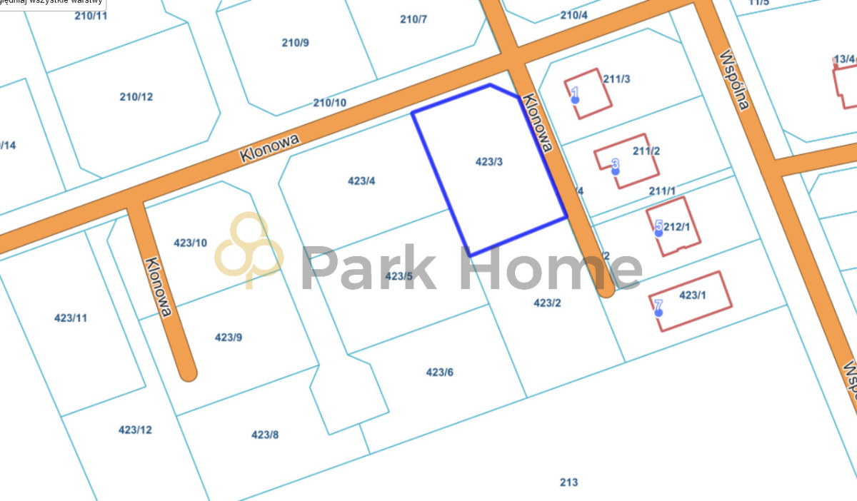 Działka o powierzchni 853 m2 ma kształt prostokąta.