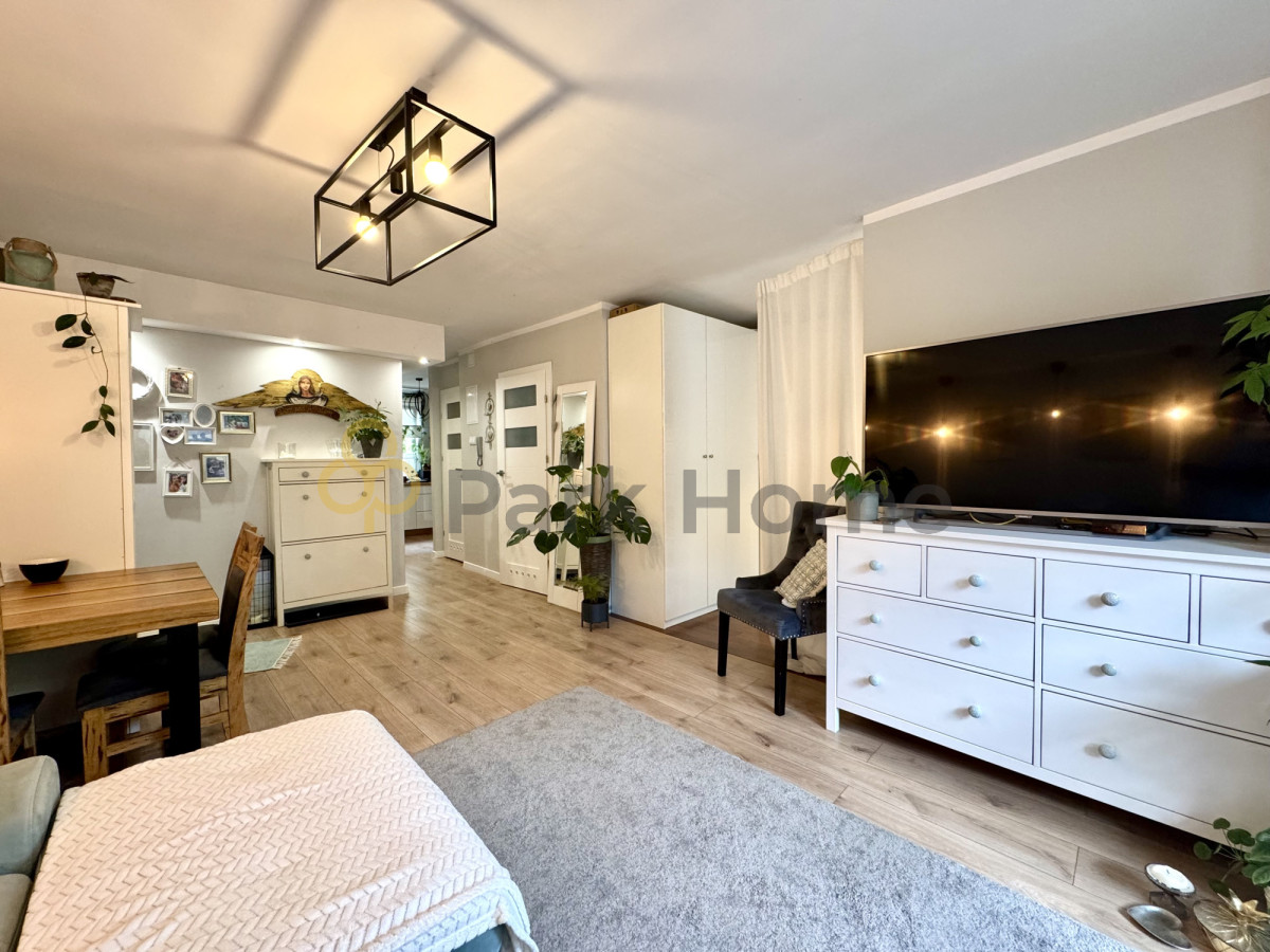 • jasnego salonu z wyjściem na balkon i przejściem do jednego z pokoi,