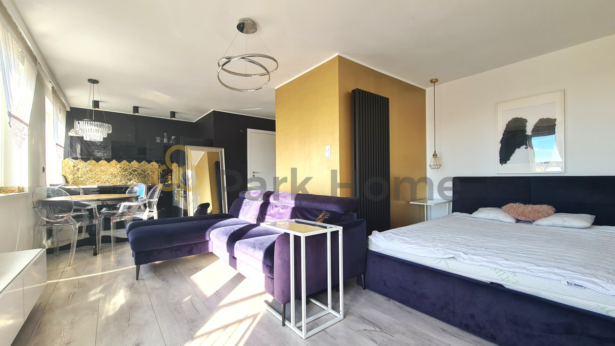 - pokój podzielony na trzy strefy: kuchnia z jadalnią, część wypoczynkowa oraz sypialniana.