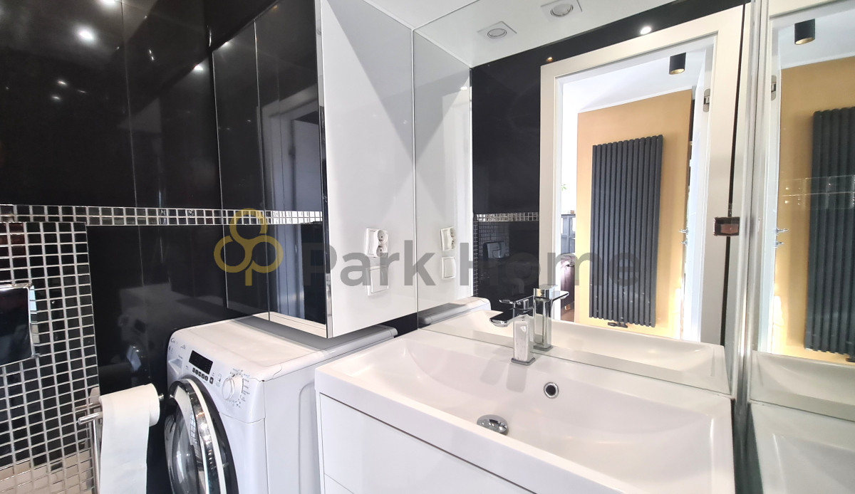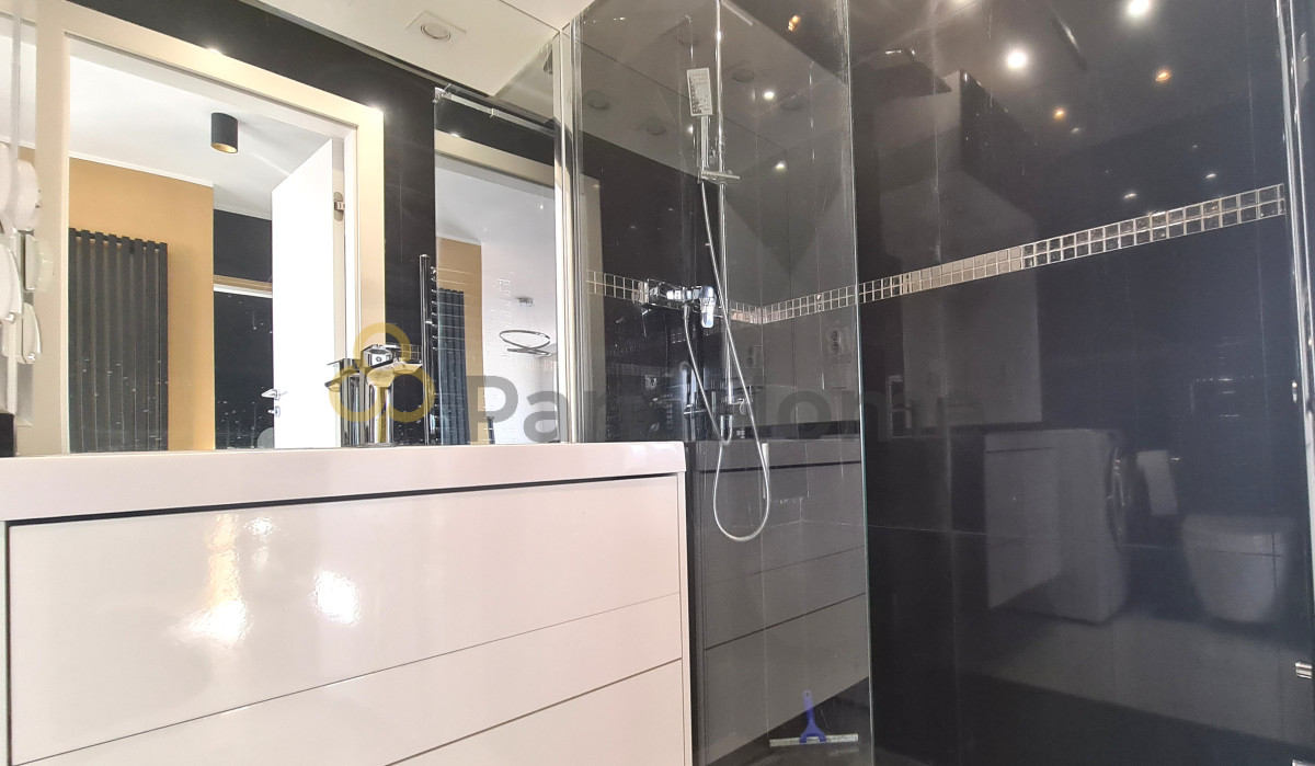 - nowoczesna łazienka z prysznicem i miejscem na pralkę,