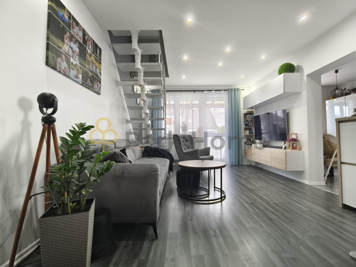 Mieszkanie dwupoziomowe z przemyślanym układem pomieszczeń, podzielone na strefę dzienną na dole i sypialną na górze. Duży metraż pozwala na wydzielenie dodatkowego pokoju (sypialnia) w wyniku zabudowy antresoli.