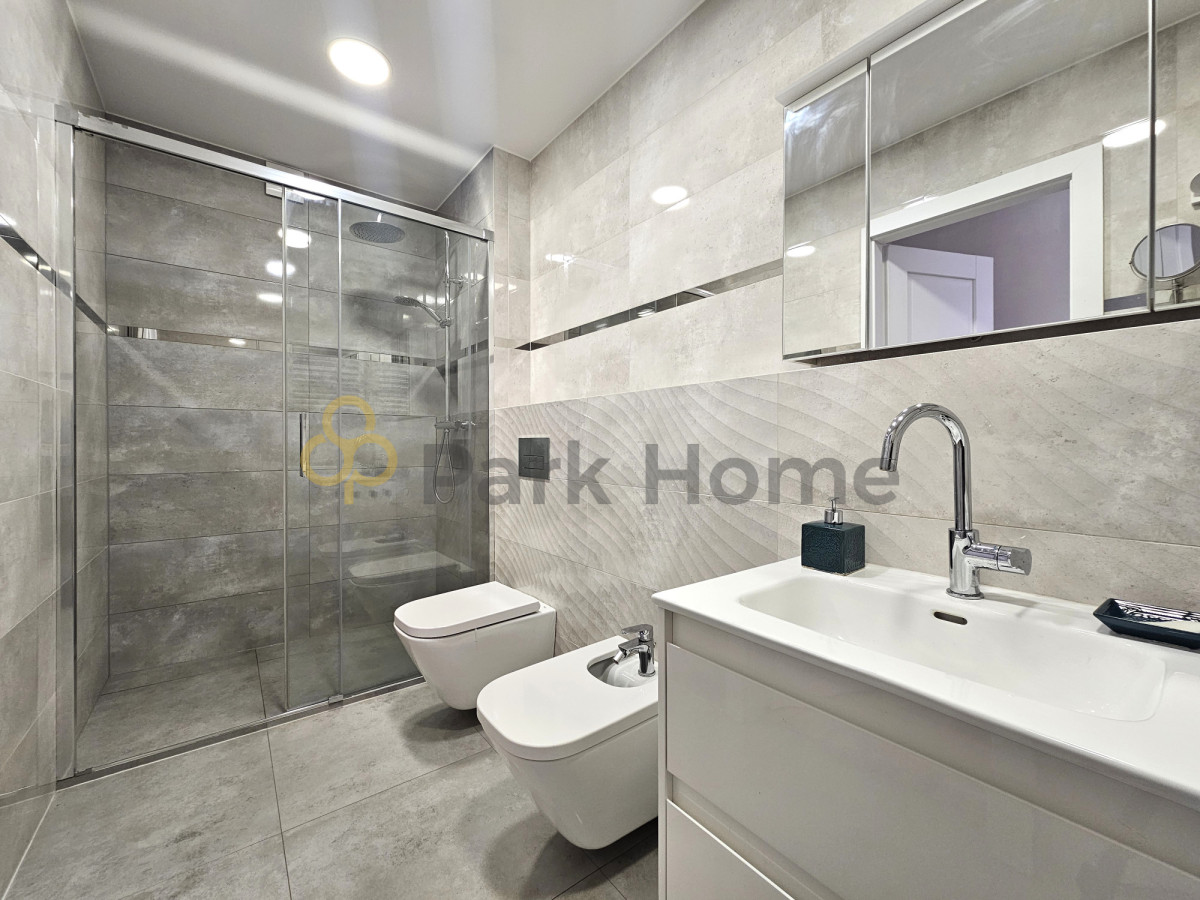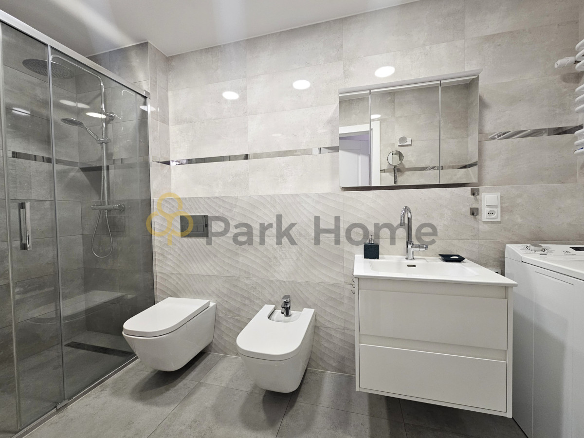 - w łazience do części prysznicowej zamontowano drzwi przesuwne (Radaway), podwieszaną toaletę oraz bidet (Roca), umywalkę i szafkę.