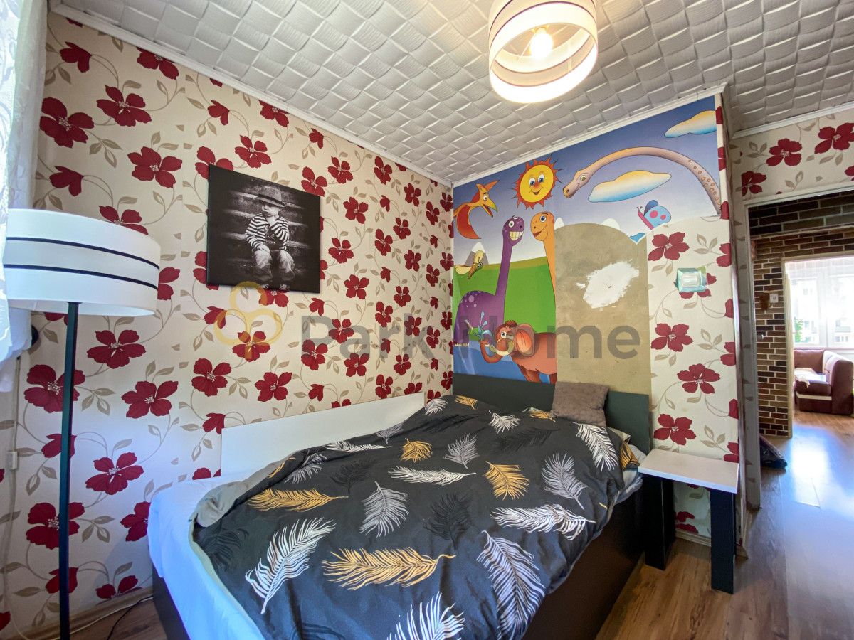 - W pokojach i przedpokoju na podłogach panele, w kuchni łazience i WC płytki.